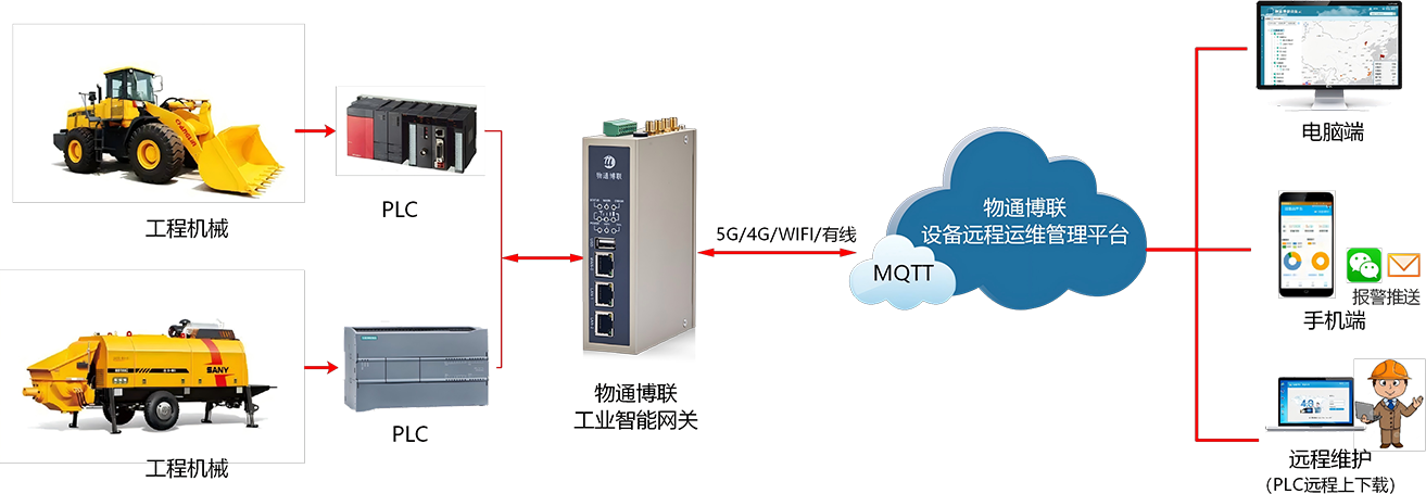 顺利获得合乐HL8 合乐的工业智能网关,连接工程机械设备的控制器、传感器等设备,实时采集设备的位置信息、运行状态(如工作、空闲、故障等)、运行参数(如发动机转速、油压、水温等)、油耗等数据。将采集到的数据传输至设备运维管理平台,平台对数据进行分析和处理。当设备出现故障时,及时发出预警,并顺利获得合乐HL8 合乐设备维护快线进行远程维护,提高维护效率,降低运维成本,实现设备全生命周期数字化管理。