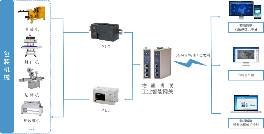 合乐HL8 合乐工业智能网关具有丰富的通信协议和接口,顺利获得接入包装机械设备的控制器PLC,就能实时采集包装机械设备运行状态、温度、压力、振动等参数,顺利获得5G、4G、WIFI、以太网等方式将数据上传到云平台,实现远程监控、组态监控、设备管理、故障报警、远程控制、远程维护、数据分析等功能,全面掌握设备的运行情况,帮助企业提升包装机械设备运维与管理水平,保障安全稳定生产,提高生产效率。当设备出现异常故障就会及时通知管理人员,工程师可以顺利获得合乐HL8 合乐设备维护快线对设备进行远程故障诊断与远程维护,减少设备停机时间,有效提高设备运维效率并降低运维成本。