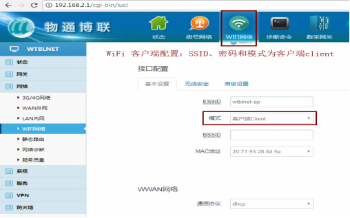 网络---可选WIFI网络、拨号网络(需要在网关通电前插入SIM卡、接好4G天线,开启拨号网络)、WAN外网。