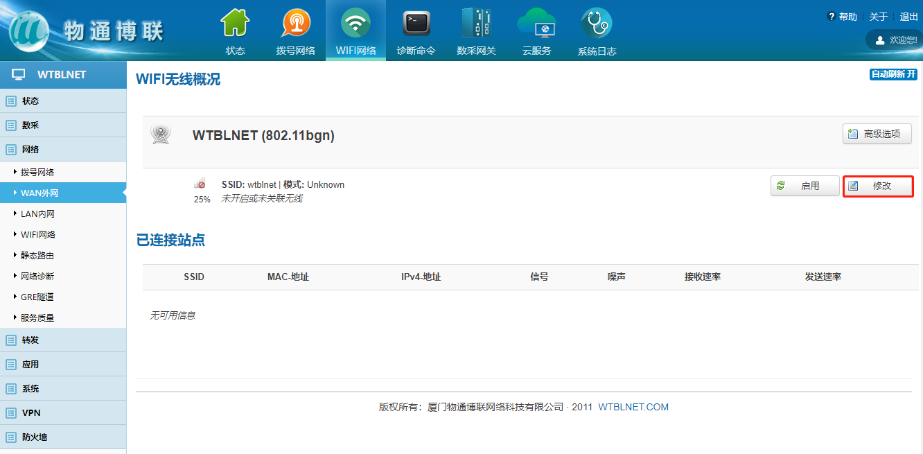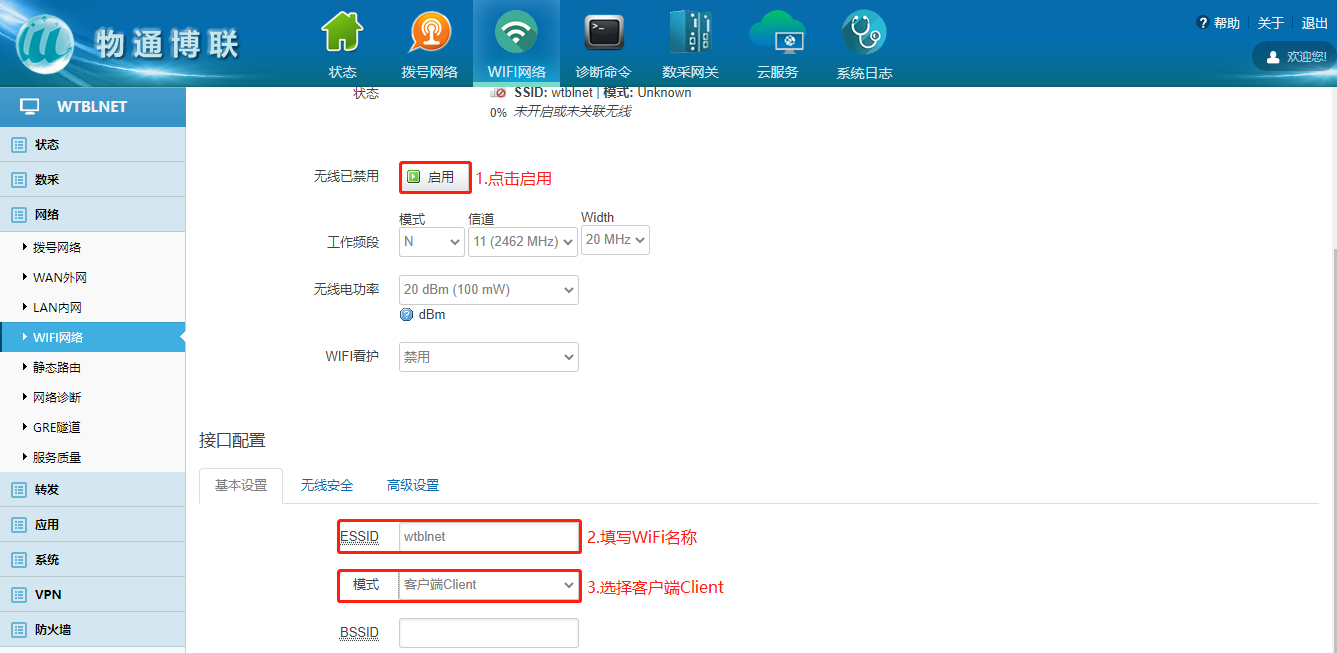 下载中心 视频中心 常见问题 售后服务 工业网关 设备快线 数据云平台 联网设备 问答百科 工业智能网关如何连接wifi热点? 时间:2022-10-26 09:15:30 点击:5547 关键词:工业智能网关,wifi 问题:工业智能网关如何连接wifi热点? 回答: (1)电脑顺利获得网线接入到网关LAN口,浏览器输入192.168.2.1默认地址 (2)登陆网关配置界面选择WiFi网络 (3)点击WiFi界面修改—进入WiFi配置界面 (4)启用WiFi—填写ESSID(WiFi名称)—模式选择客户端Client (5)点击无线安全—输入WiFi密码 注意:WiFi获取到的IP网段与网关LAN口的IP网段不能重复! 上一篇:工业智能网关如何更新程序和固件? 下一篇: 工业智能网关如何使用流量卡上网?