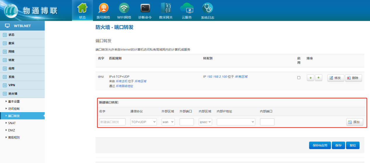 下载中心 视频中心 常见问题 售后服务 工业网关 设备快线 数据云平台 联网设备 问答百科 工业网关如何配置端口映射? 时间:2022-10-26 09:39:53 点击:5265 关键词:工业网关,网关配置,端口转发 问题:工业网关如何配置端口映射? 回答: 网关配置界面—防火墙—端口转发 端口转发允许来自Internet的计算机访问私有局域网内的计算机或服务 使用场景:端口转发是将发往外网的一个端口的通信完全转发给内网一个地址的指定端口 上一篇:如何顺利获得合乐HL8 合乐工业网关实现网口设备远程上下载? 下一篇: 工业智能网关支持的电压范围?