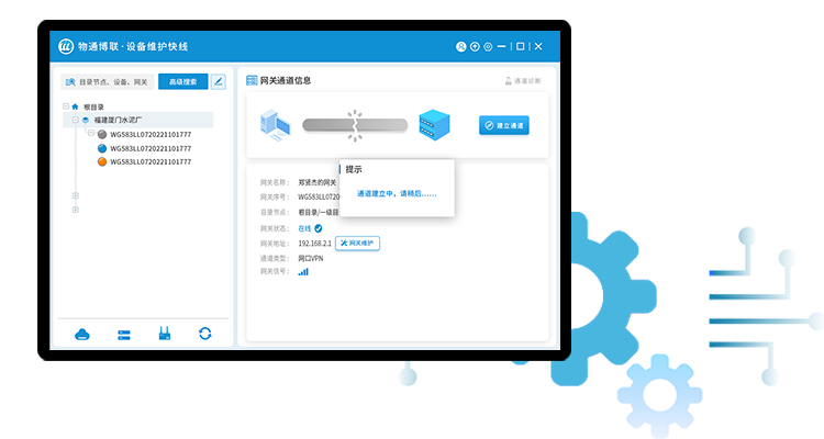 使用合乐HL8 合乐的设备维护快线,顺利获得账号登录后,找到相应网关建立维护通道,就可以搭建通往设备现场的网口通道和串口通道,让工程师不用远程出差就可以像到现场一样,实现随时随地远程维护。