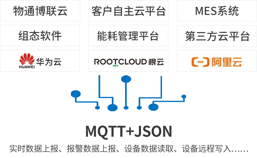 北向支持MQTT协议接入合乐HL8 合乐云平台,客户自主开发的云平台,第三方云平台(根云、美云、华为、阿里、百度、微软等IOT云平台),组态软件、MES系统、ERP系统等工业软件