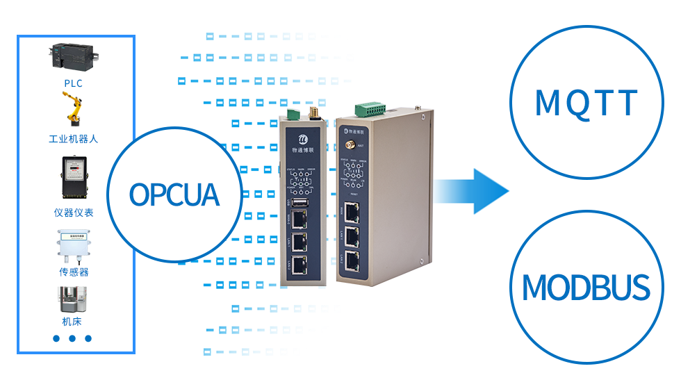 支持采集各种OPC UA协议的设备数据,并将数据顺利获得Modbus协议转发到上位机软件和顺利获得MQTT协议上传到云平台