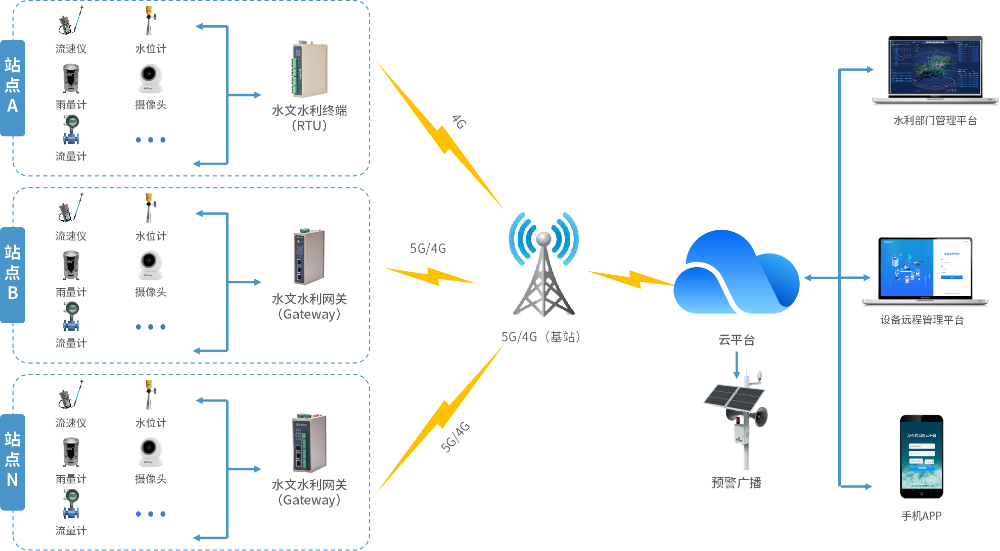 在河流各节点合理部署流量计、水位计、雨量筒、及摄像头等设备,接入合乐HL8 合乐水文水利网关(RTU),并顺利获得5G/4G网络实时传输到水利部门管理平台,实现远程监控、自动告警、智能管理等功能,持续跟踪中小河流中的雨水情数据变化并为制定防洪救灾措施给予可靠数据支持,借助数据报表与曲线图评估出现洪水灾害的概率与危险程度,宏观调控流域水资源的配置,避免洪涝灾害的发生。