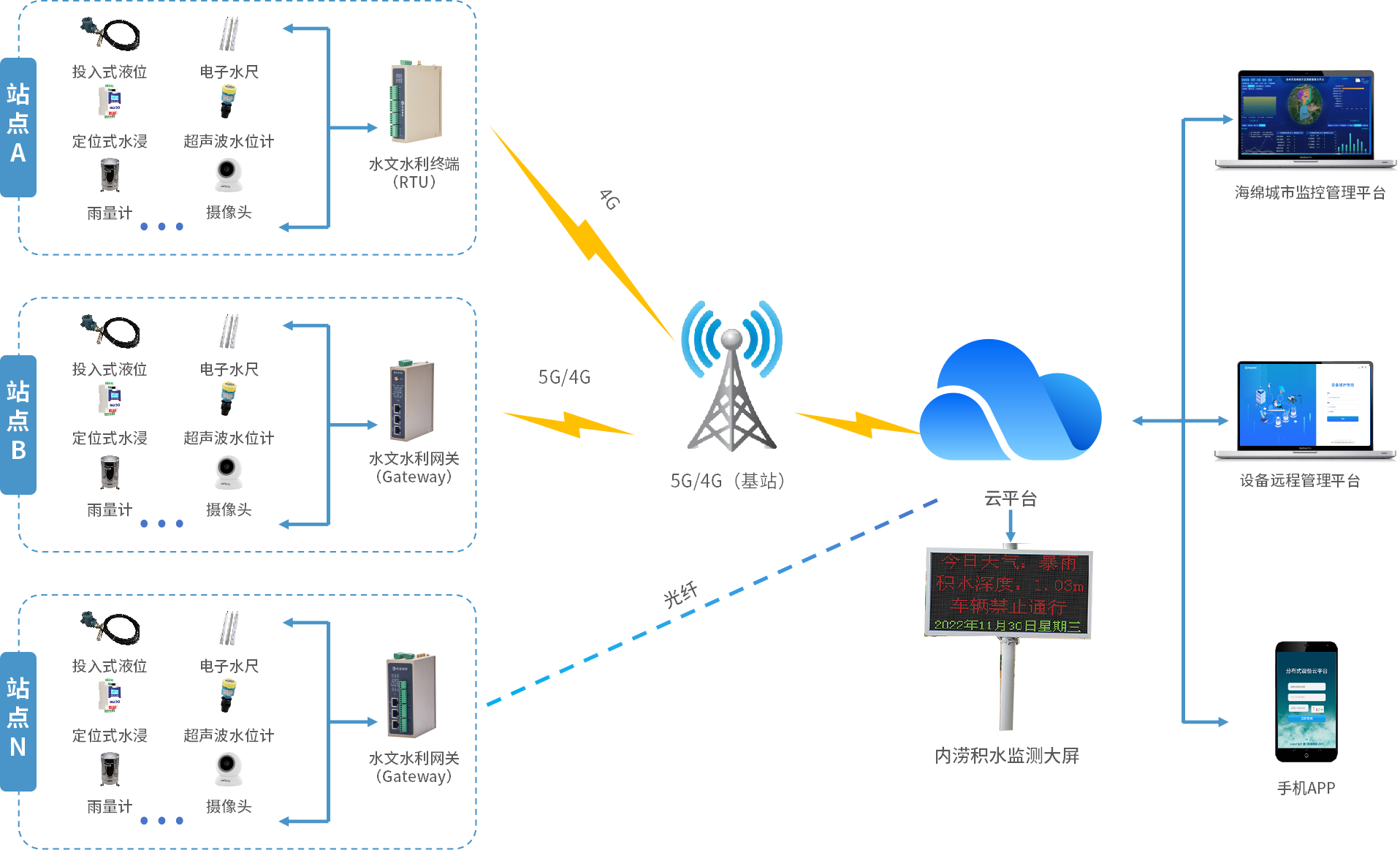 在城市关键区域(如低洼地带、排水系统关键节点、主要道路交叉口等)部署智能水位监测传感器、雨量计及视频监控设备,实时收集降雨量、水位变化、水流速度等数据,顺利获得合乐HL8 合乐水文水利网关采集数据,并顺利获得5G/4G或光纤网络远程传送至城市内涝监测预警中心,实现实时监测,水位过高、设备异常时系统自动报警,并顺利获得手机短信等渠道自动向负责人发布预警信息,提醒相关部门采取相应措施解决所面临的积水问题,并借助广播、电视、LED显示屏等媒体为广大群众给予出行指南,避免人员、车辆误入深水路段造成重大损失。