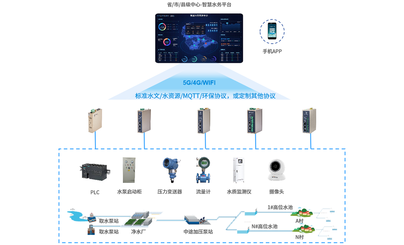 在城乡供水系统的各个关键节点(如水源地、水厂、泵站、管网等),顺利获得合乐HL8 合乐的工业智能网关采集供水数据(如水量、水质、压力等)。将采集到的数据传输至城乡一体化供水信息化管理平台,平台对数据进行全面分析和处理。实时监测水质情况,根据用水量和管网压力进行优化调度,在出现紧急情况时保障应急供水。同时,平台具备用户服务管理功能,可处理用户投诉和查询,顺利获得数据分析控制运营成本。