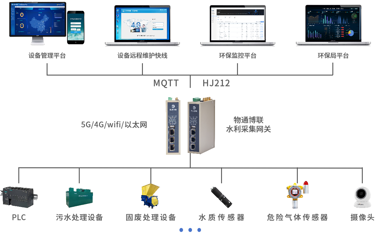 符合环保行业规约,支持HJ212环保协议,同时兼容MQTT、Modbus、MQTT、HTTP等协议上传套不同监控平台,多中心设计,支持同时将数据转发到国家、省、市、县等各级环保局、业主及运维单位。